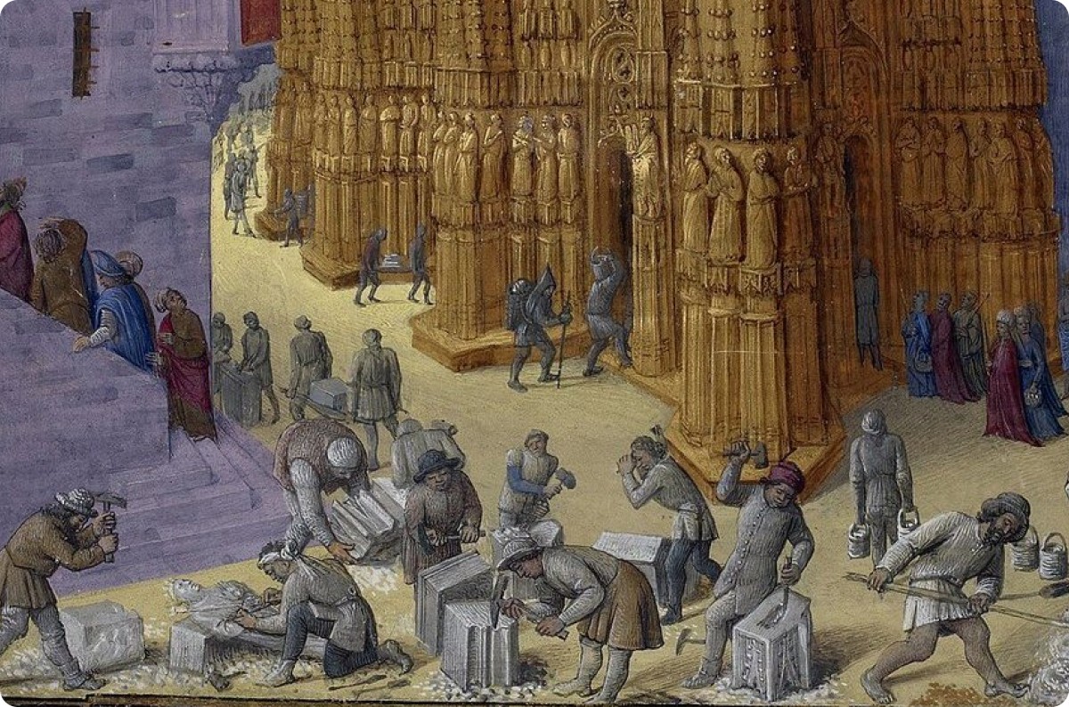 Jean Fouquet, The Building of the Temple of Jerusalem, c. 1470–1475. Tempera and gold on vellum. Bibliothèque nationale de France, Paris.